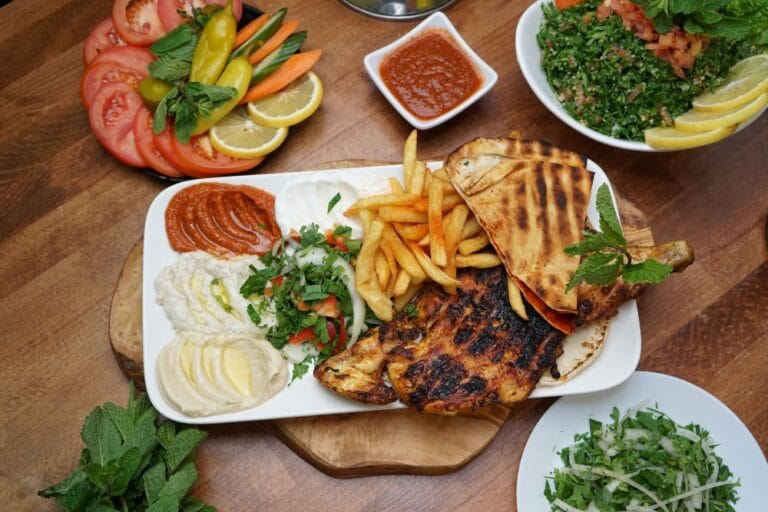 mit größtes Brot, Hummus, Pommes, eingel. Sauergurken & Knoblauchsoße